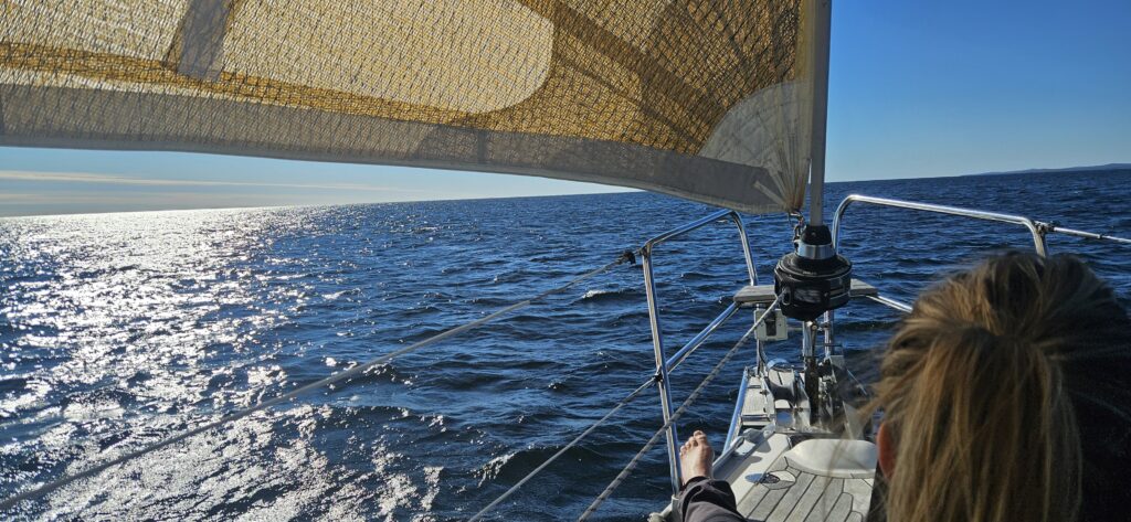 Vid 11 kastar vi loss med lätthet och tar oss utomskärs för att sätta segel mot Ulvön. Med 6 m/s stadig nordvästlig vind börjar Helga glida med 5-6 knop i samma riktning som havets vågor. Det är en behaglig tur med lagom fart, lite sjögång och härlig höstsol! Vi njuter av tystnaden, porlet av vattnet och känslan av havet!