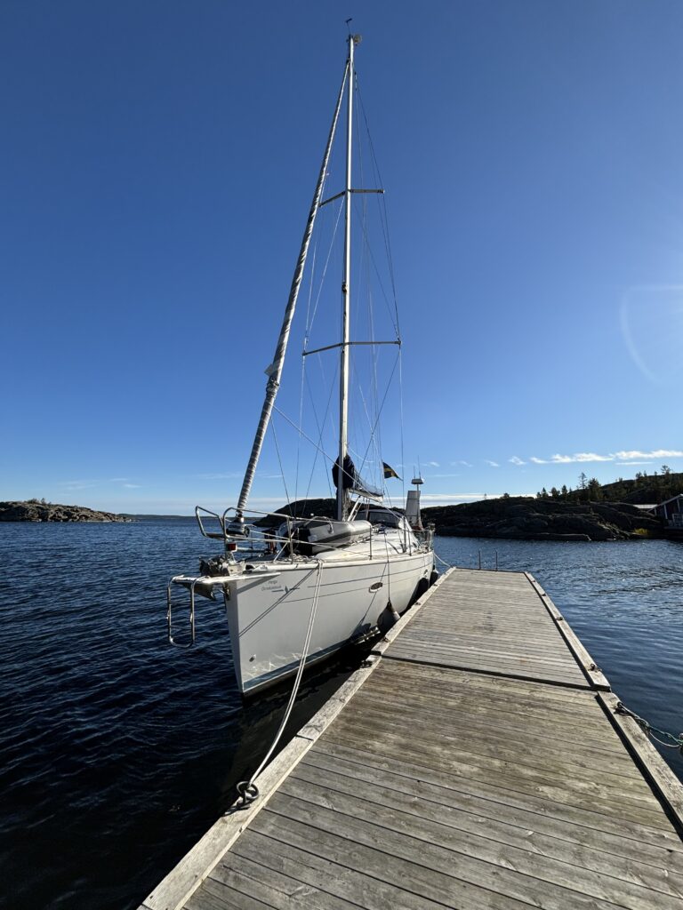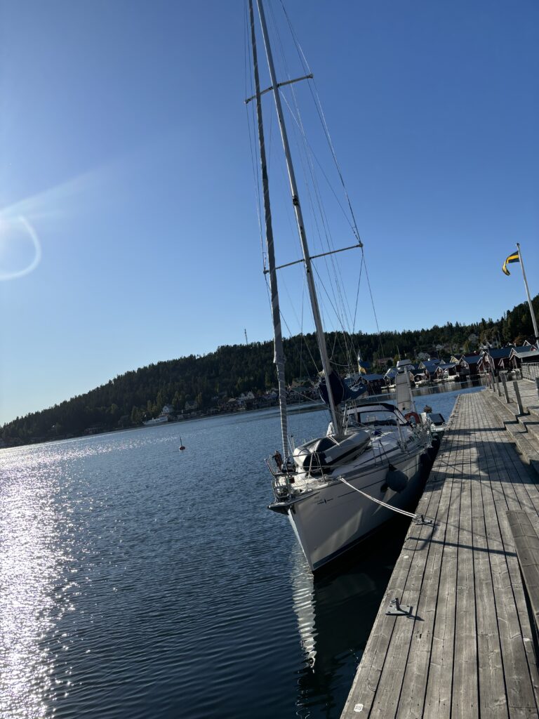 Hunger och trötthet satte stopp för orken, så vi plockade ner seglen och gick för motor ut till Grisslan. Vi är ensamma när vi anländer vid 19-snåret på kvällen, så vi väljer att lägga till längsgående med bryggan. Det är lite medvind in i viken, men en rätt odramatiskt tilläggning utan stök.