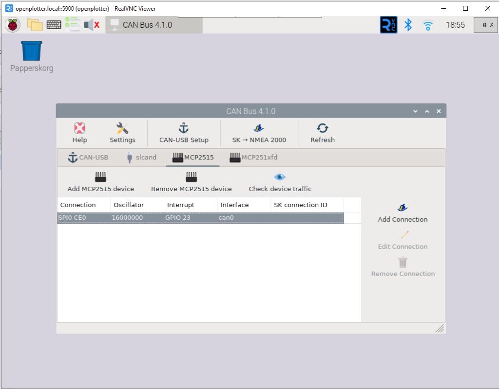 För att vi ska få in data från CAN-bussen behöver vi berätta för vår serverprogramvara att den kan och får läsa från can-kortet. Detta gör man genom att gå in på Meny -> OpenPlotter -> CAN Bus. Där väljer man initialt MCP2515 (vilket är vår korttyp) och sedan ”Add Connection”. Det script vi körde tidigare gör att kortet redan syns i listan, vi behöver bara koppla det till servern.