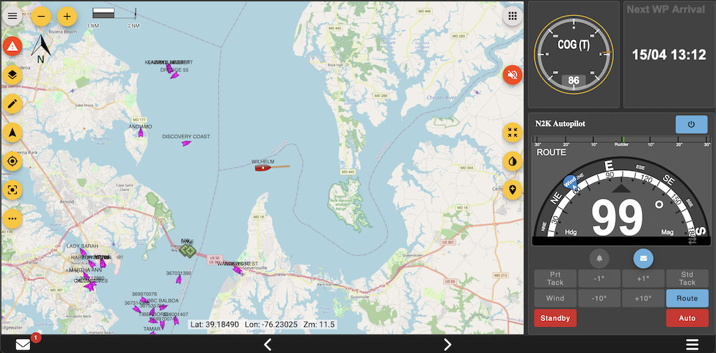 Till och med mjukvarukontroll av autopilot verkar gå att få, via SignalK-Autopilot https://github.com/SignalK/signalk-autopilot/tree/master, även om dokumentationen är något luddig här. Dels så kan jag inte utläsa om pluginet är färdigutvecklat, eller om jag behöver ge mig på att göra hemsidan som skickar kommandon enligt specifikationen. Ofta är hjälpavsnitten dåligt gjorda när det gäller öppen källkod, utvecklaren har ju löst sitt problem. Dels är jag inte helt säker på att autopiloten accepterar kommandon från STNG via konvertern till ST1, även om det borde vara så. Detta ska bli intressant att se om det fungerar.