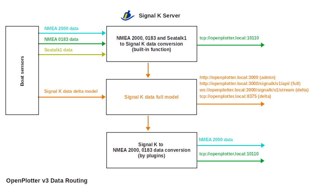 Kärnan i OpenPlotter är serverprogramvaran SignalK https://signalk.org/index.html vilken fungerar som ett informationsnav i systemet. Programvaran läser in sensor- och instrumentdatan från båtens datanätverk (STNG/ST1/NMEA 0183/NMEA 2000, vilka alla egentligen är olika generationer av CAN-nätverk, samma typ av nätverk som styrt funktionerna i bilar sedan 90-talet) samt översätter dem, och gör dem tillgängliga på tcp-ip-nätverket (båtens LAN, eller för den delen Wi-Fi). Från denna server kan webapplikationer hämta den information den är intresserad av, och det går också att skicka information från webapplikationerna för översättning och vidare transport ut på CAN i båten.