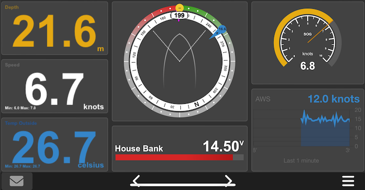 För att göra detta behöver man få information visad för sig. Bläddrar man runt bland funktionerna och pluginsen som finns i det mer eller oändliga bibliotek man får tillgång till genom OpenPlotter så hittar man snabbt pluginet (till SignalK) KIP https://github.com/mxtommy/Kip vilket är en grafisk display av den data man väljer att visa via html (det medium du nu använder, en internetsida). Väjer man att titta på datan med en mobil enhet (android/ios) kan man spara ner genvägen på hemskärmen så att upplevelsen blir densamma som en dedikerad app för funktionen.
