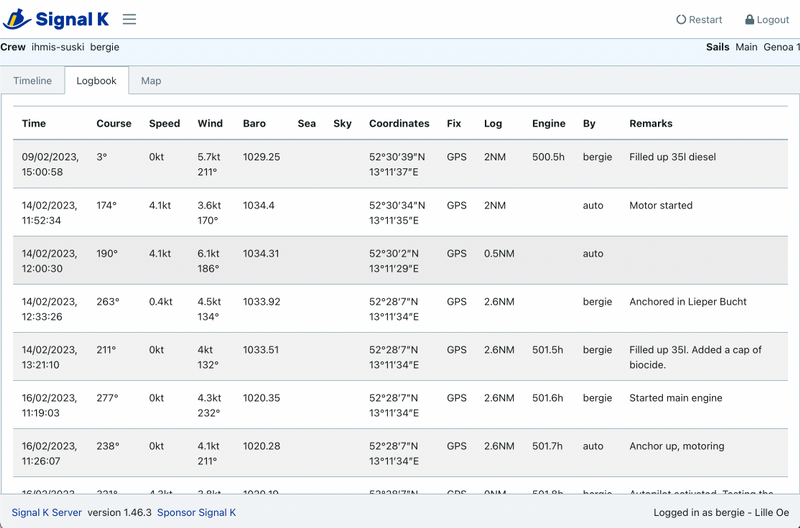 Med pluginet Semi-Automatic electronic logbook för SignalK https://github.com/meri-imperiumi/signalk-logbook kan servern tjäna som vår logg ombord, och loggningen kan förhoppningsvis bli betydligt bättre än den är nu, och innehålla faktisk information om position, fart och segelsättning (med pluginet Sails configuration and inventory https://www.npmjs.com/package/@signalk/sailsconfiguration). Här har vi ett blogginlägg av utvecklaren där han beskriver det ytterligare, https://bergie.iki.fi/blog/electronic-logbook/.
